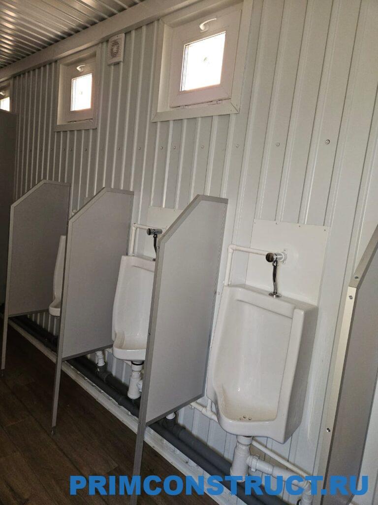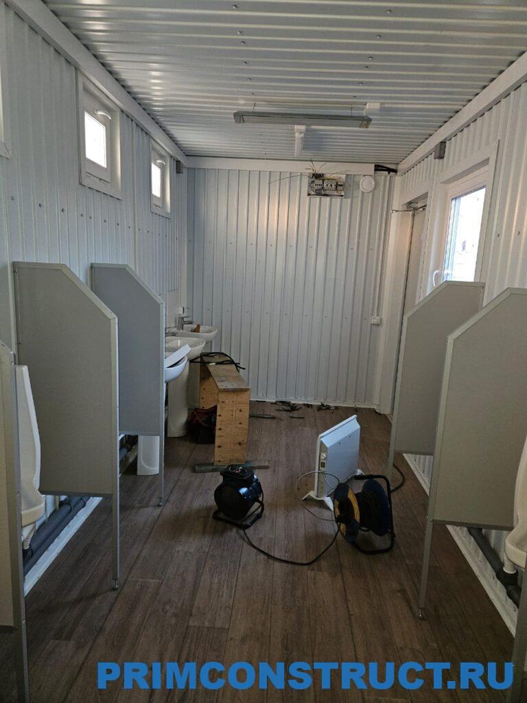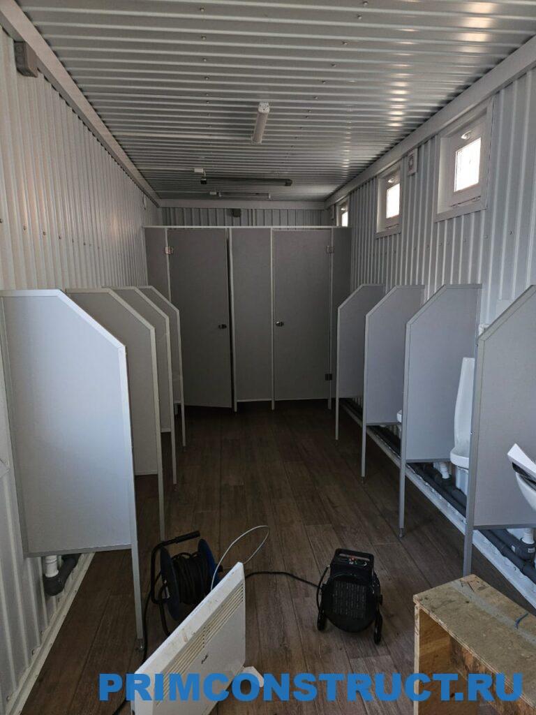 Три раздельных блока: автономный блок с баками воды, отдельный санузел на 1 персону и блок с несколькими санузлами. Все размещено в 40 футовом контейнере.
